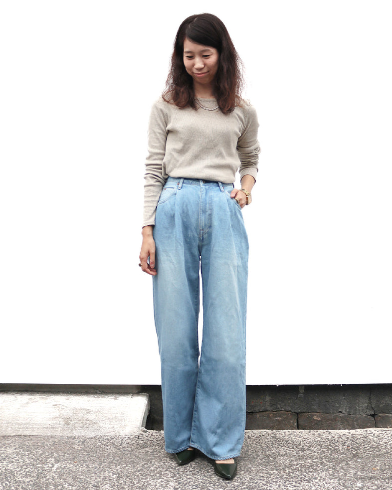 裾に向かってすっと落ちるワイドストレートシルエット。