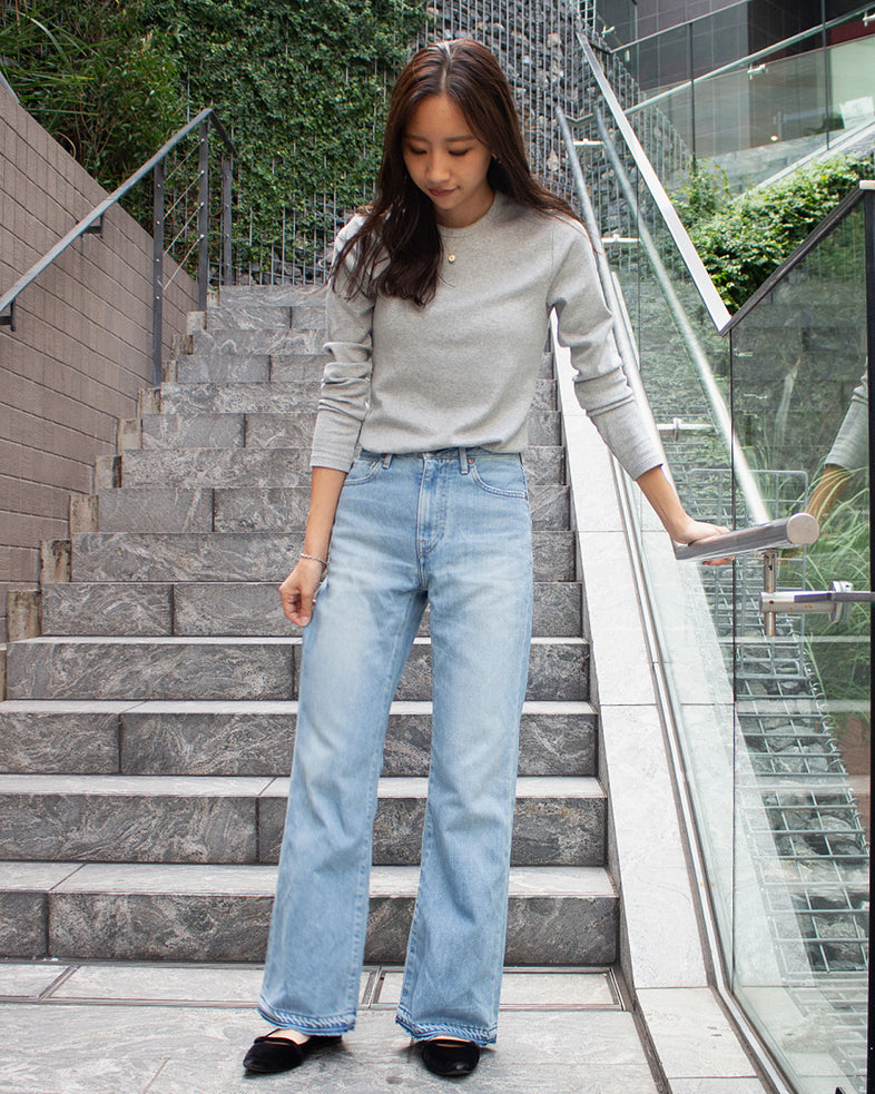 A mid-rise flare silhouette designed to create a graceful curve along the leg.