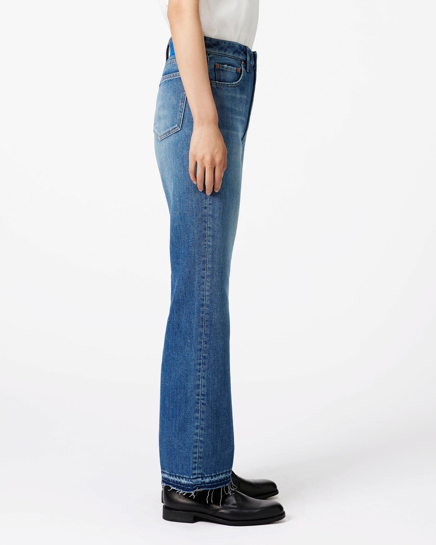 A mid-rise flare silhouette designed to create a graceful curve along the leg.
