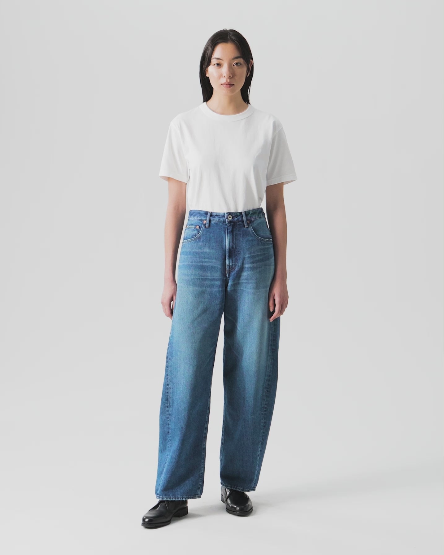腰から太ももにかけてゆとりを持たせ、裾に向かって緩やかにカーブする独特のラインが、自然な立体感と抜け感を表現しています。