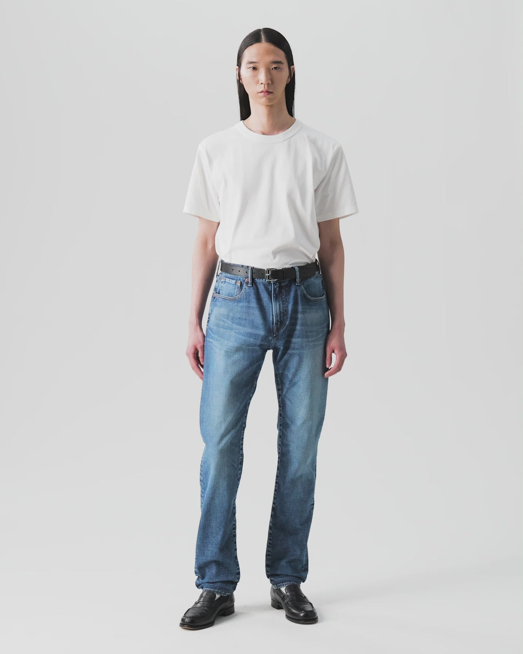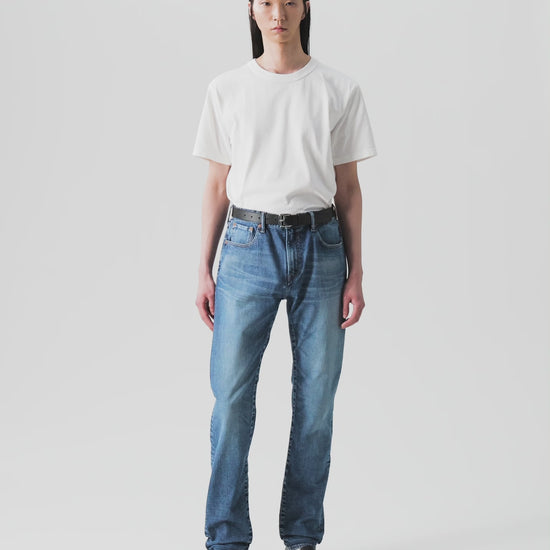 やや浅めの股上で、ゆるやかなテーパードがかかる細身のストレート。