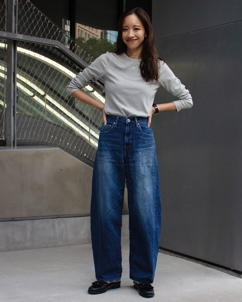 腰から太ももにかけてゆとりを持たせ、裾に向かって緩やかにカーブする独特のラインが、自然な立体感と抜け感を表現しています。