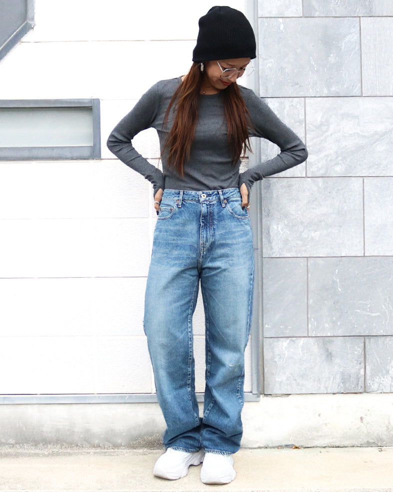 股上は深く、程よいラフさを感じるられるように設計されたストレートシルエット。