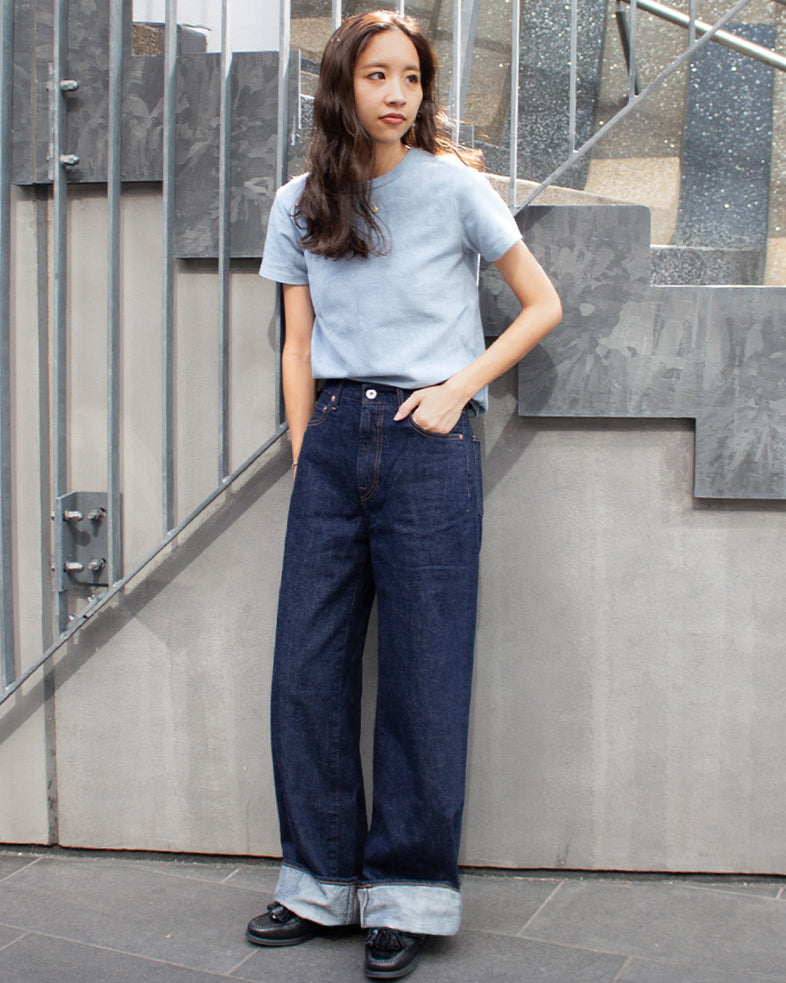 裾に向かってボリューム感のあるワイドストレートシルエット。